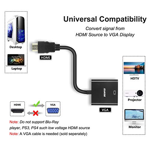 - COMPACT DESIGN – The compact-designed portable Benfei HDMI to VGA adapter connects a computer, desktop, laptop, or other devices with HDMI port to a monitor, projector, HDTV, or other devices with VGA port; Tuck this lightweight gadget into your bag or pocket to do a business presentation with your laptop and projector, or extend your desktop screen to a monitor or TV; A VGA cable is required.