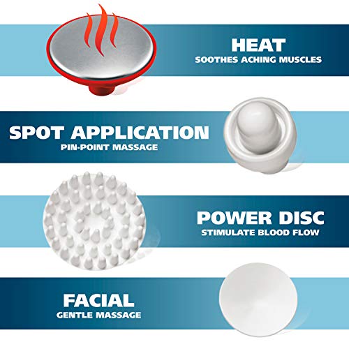 • 4 Unique Attachment Heads ? Heat disc for soothing aching muscles, Spot application head for pin-point muscle massages, Power disc head for stimulating healthy blood flow, and a Facial attachment head for gentle facial massages